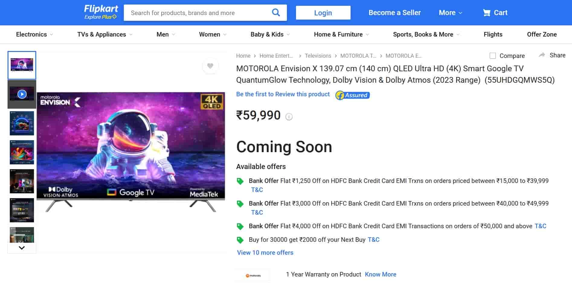 Motorola will be revealing the price of the Motorola Envision X Smart TV on the 4th of July 2023 on the Flipkart shopping website. The launch page of the upcoming device has been listed and recently the 55″ variant has also been listed on the shopping platform with a price tag of Rs. 59,990.