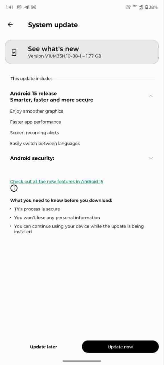 The update arrives with firmware version V1UM35H.10-38-1 and the size of this update is 1.77GB. The new Android 15 release is also pointed out to be smarter, faster, and more secure. Smoother graphics, faster app performance, screen recording notifications, and easy switching between languages are also some of its key specs.