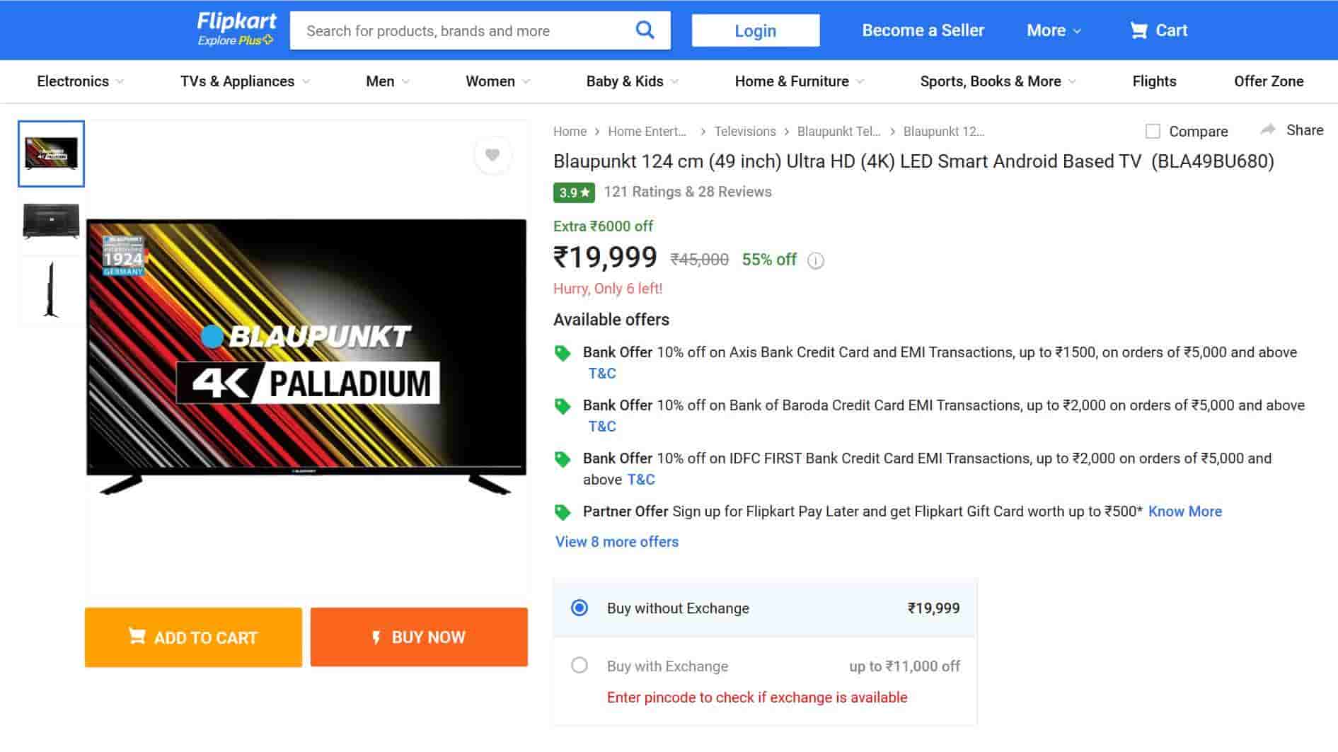 The Blaupunkt Ultra HD (4K) LED Smart TV is now available on Flipkart at an exciting discount price.
