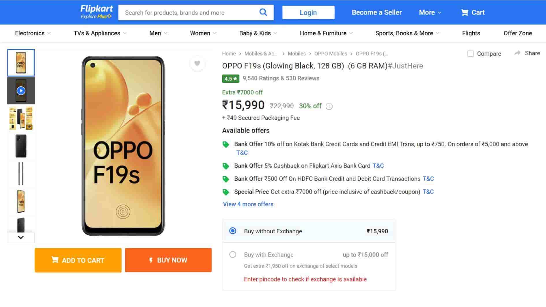 The OPPO F19s smartphone is now available on Flipkart at an exciting offer price of Rs. 15,990. This is 30% off its actual list price of Rs. 22,990. A package fee of Rs. 49 is also included with the product.