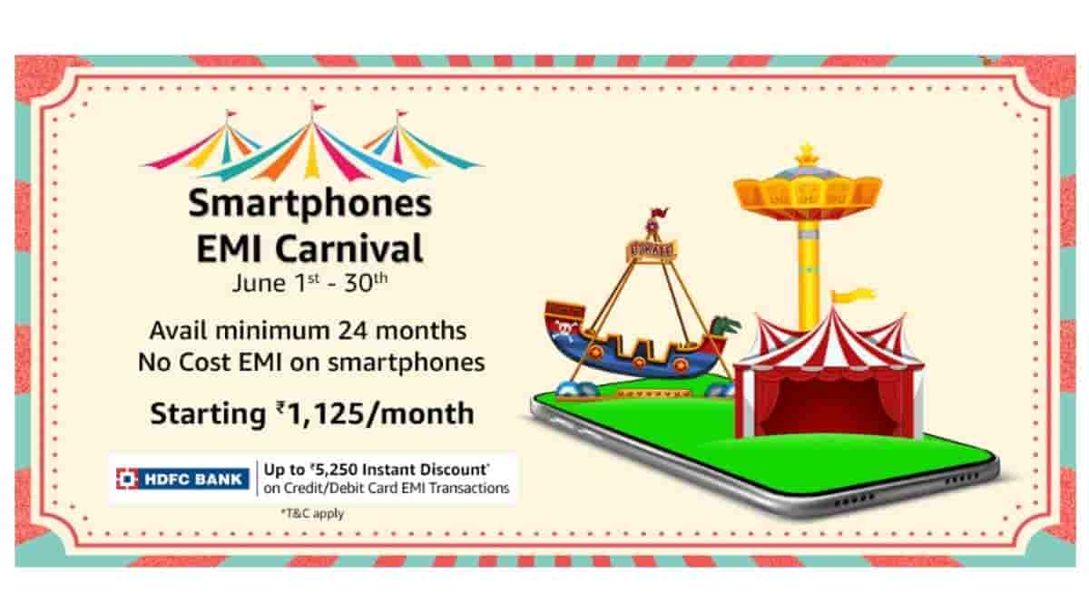 The Smartphones EMI Carnival started on June 1st and it will end on June 30th on Amazon. During this period, get a minimum of 24 months of No-Cost EMI on smartphones, starting at Rs 1,125. Also, get up to Rs 5,250 instant discount with an HDFC Credit/ Debit Card EMI transaction.