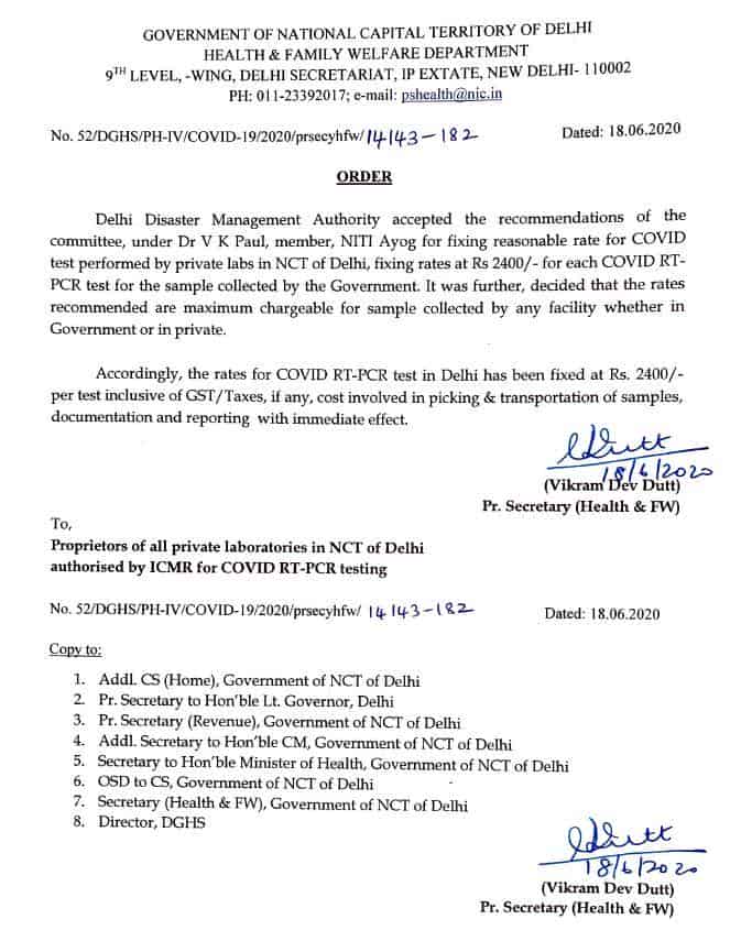 According to the latest updates, Test kits to be available in Delhi at a fixed price of Rs 2400. There is a copy of the order that states according to the recommendations of Dr. V K Paul member of the Niti Ayog to fix the testing rates of COVID RT PCR testing.