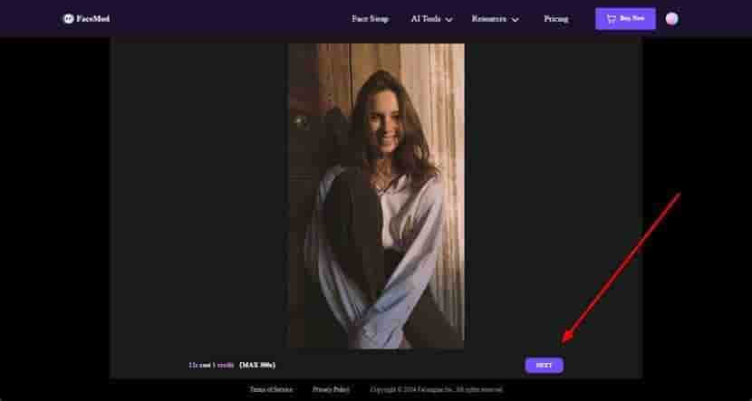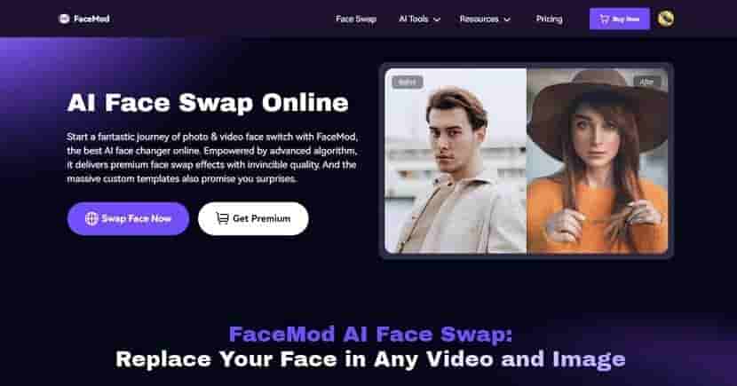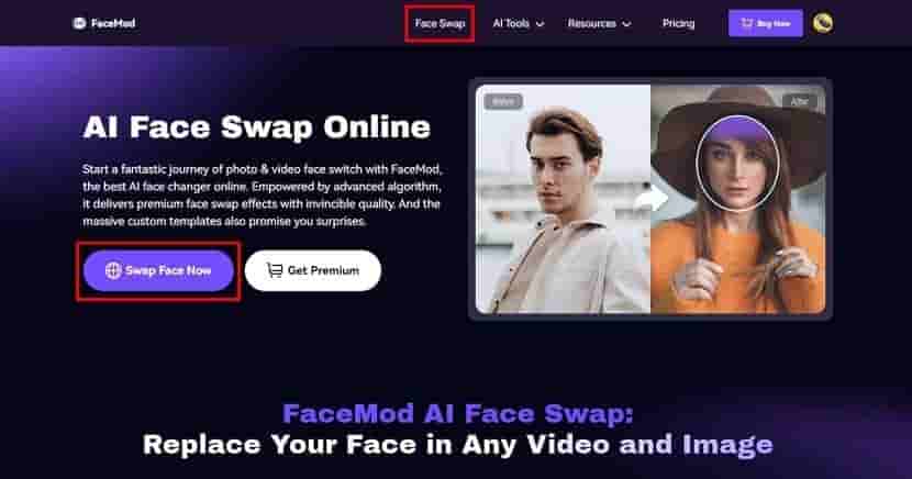 Go to FaceMod’s official website and pick “Face Swap” from the homepage. Next, click the “Swap Face Now” button, which will open a new window.