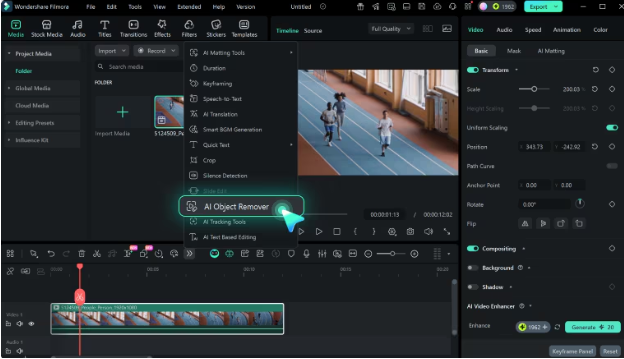 Drop your video into Filmora’s timeline, and click to select it. Turn on AI Object Remover from the toolbar. In just one click, you’re ready to clean up distractions and refine your shot.