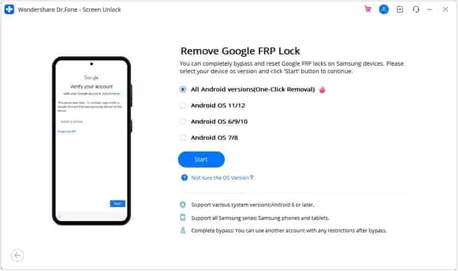 Next, choose the “Remove Google FRP Lock” tool, connect your device, and specify “Samsung” as your Android brand. Press the “Start” button to move forward and select the “All Android versions (One-Click Removal)” feature.