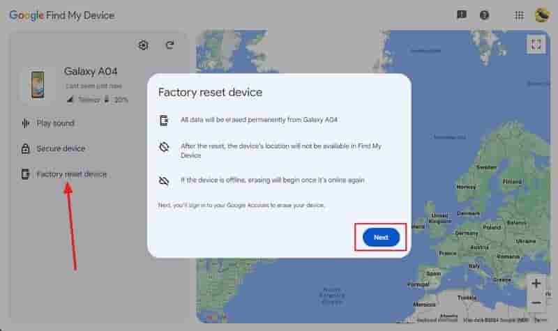 Step 2. Following this, they will have to choose the “Factory reset device” option and press the “Next” button on the pop-up to erase and remove the FRP lock from your Samsung device.