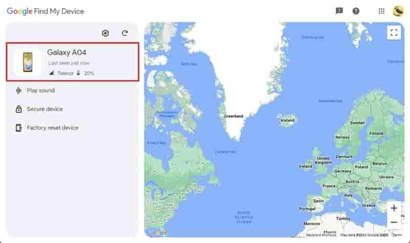 Step 1. Ask the owner to access the Google Find My website on their device’s web browser and log in with the same Google account used on the FRP-locked phone. Here, they will need to select your Samsung device from the left panel.