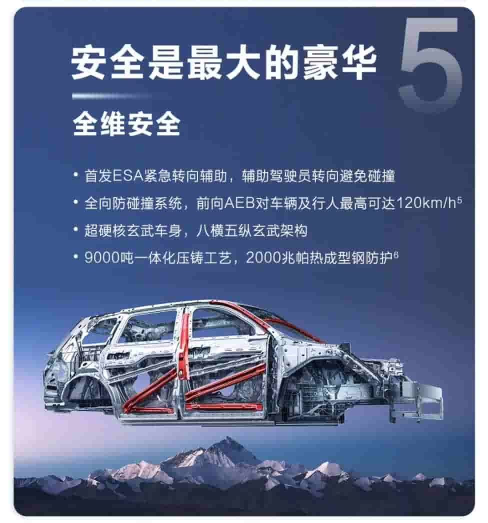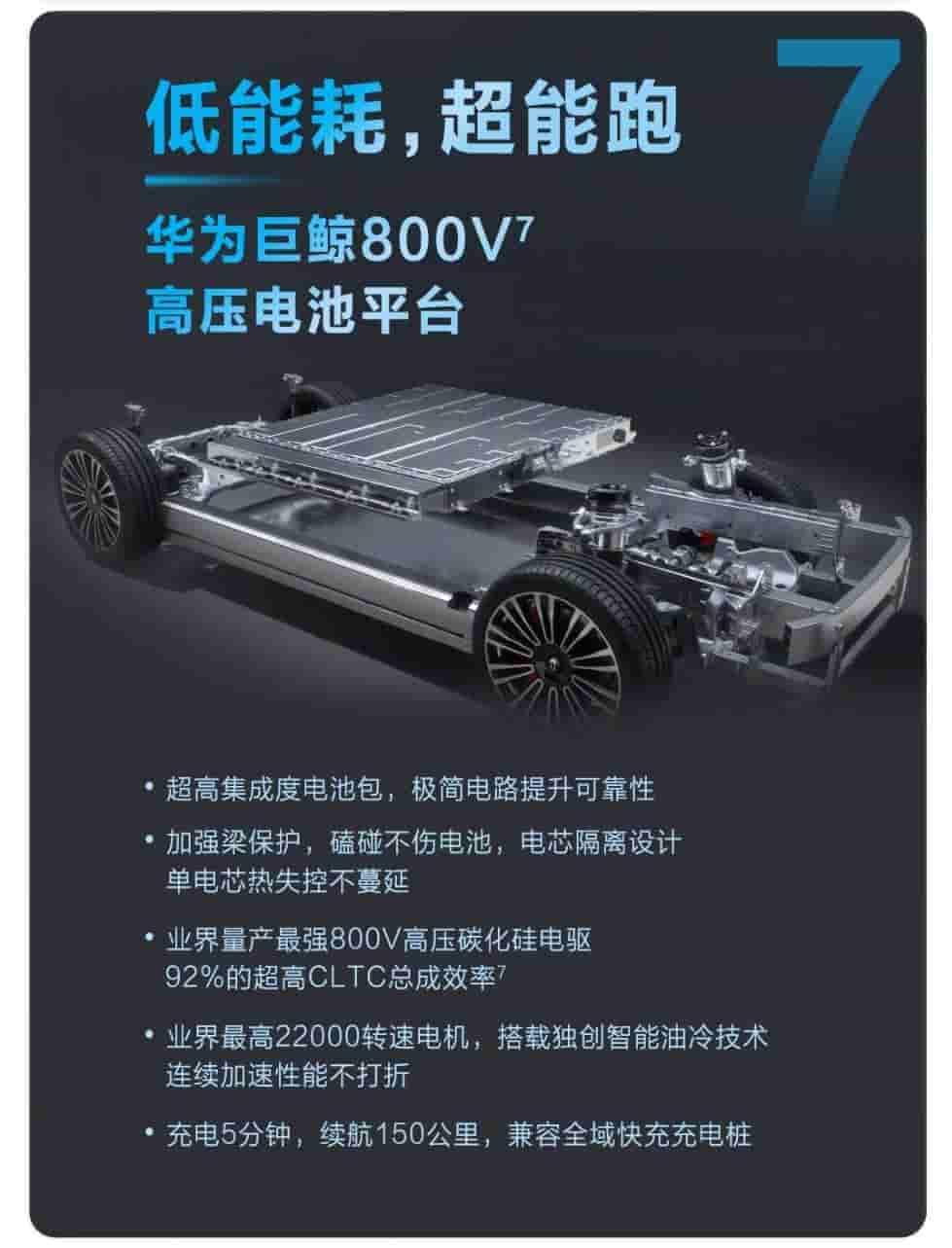Huawei’s Whale 800V7 high voltage battery platform brings super running and low power consumption to the SUV. The ultra-highly integrated battery pack and minimalistic circuit improves reliability. The strengthened beam protection assures that bumps never cause any damage to the battery, and the cell isolation design prevents single cell thermal runaway from spreading.