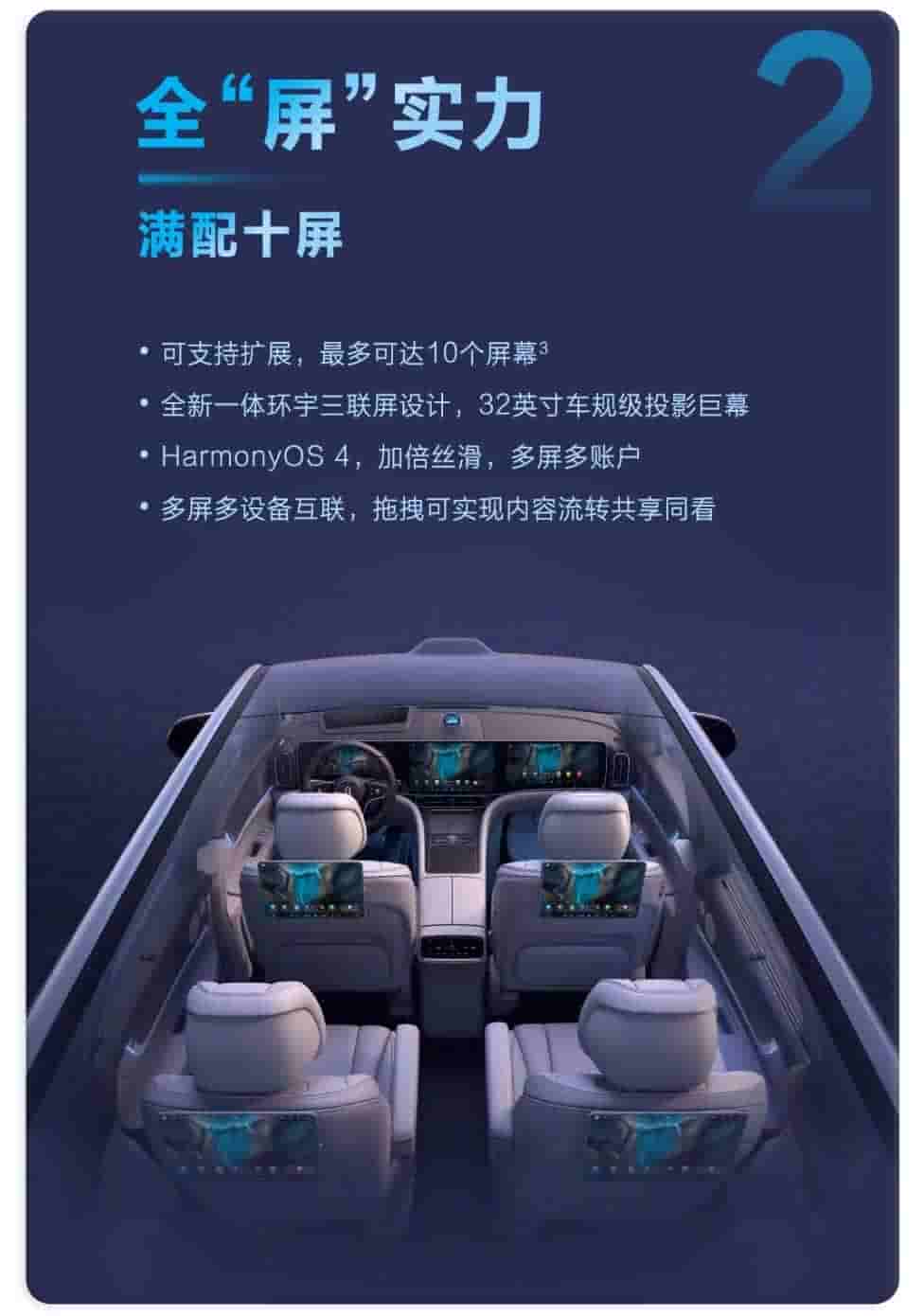 The SUV also supports up to 10 display screens, with a new integrated universal triple screen design and a 32-inch car grade projection giant screen. The HarmonyOS 4 is also twice as smooth as before, with features like multi-screen and multi-account connectivity.