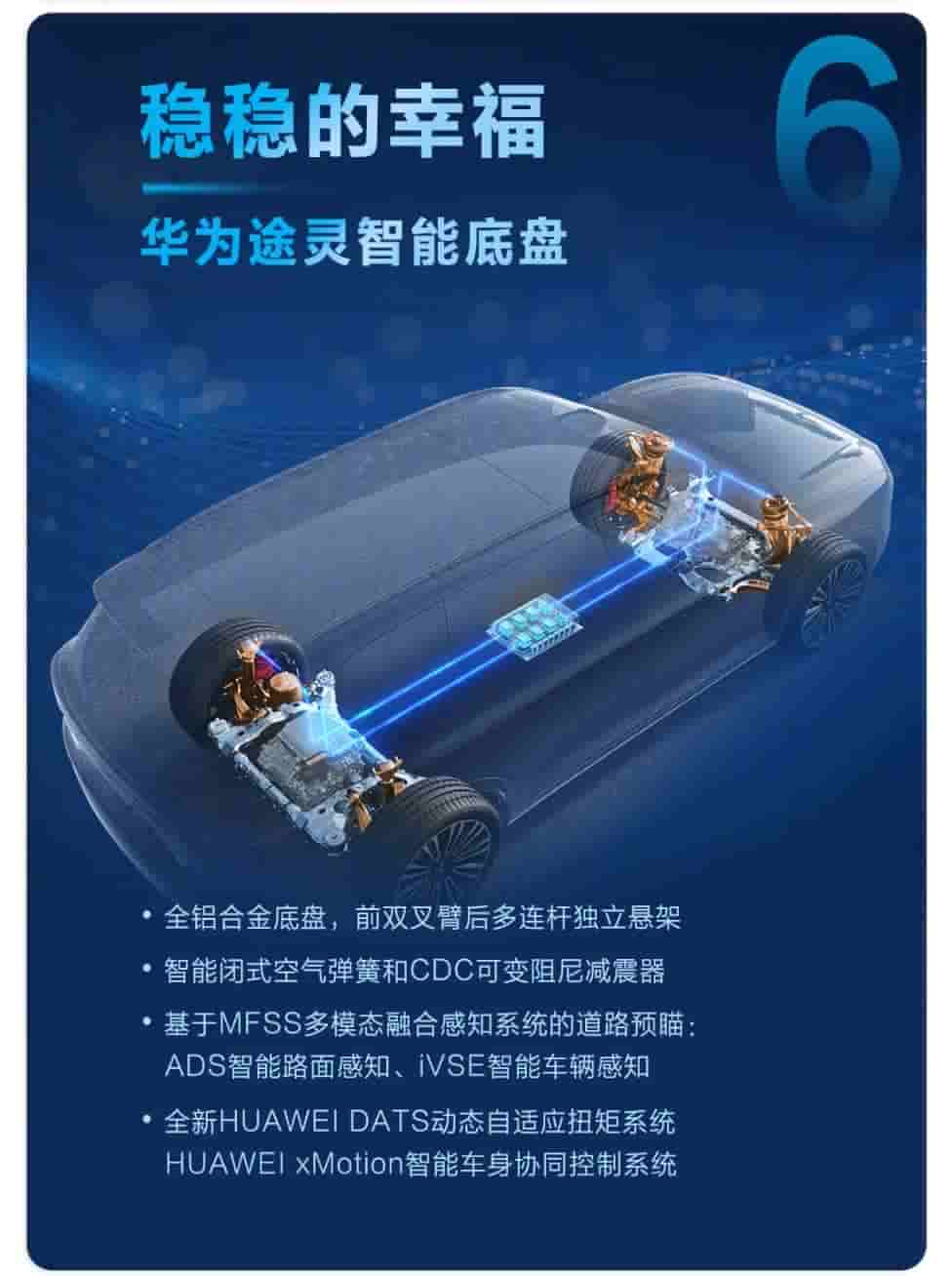 The Huawei Touring Intelligent Chassis is another important feature of the SUV. All-aluminum alloy chassis, front double wishbone, rear multi-link independent suspension, intelligent closed air springs, CDC variable damping shock absorbers, road preview based on MFSS(multi-modal fusion sensing system), intelligent road surface sensing, IVSE intelligent vehicle sensing, Huawei’s new Dynamic Adaptive Torque System(DATS), and Huawei X Motion intelligent body collaborative control system are also features integrated to it.
