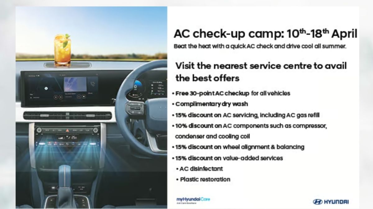 This initiative will provide customers with special benefits on AC checkups & related jobs, wheel alignment & balancing, and selected value-added services. The AC Checkup Camp will be conducted across Hyundai’s widespread service network, enabling customers to conveniently access expert diagnostics, genuine parts and trained technicians.