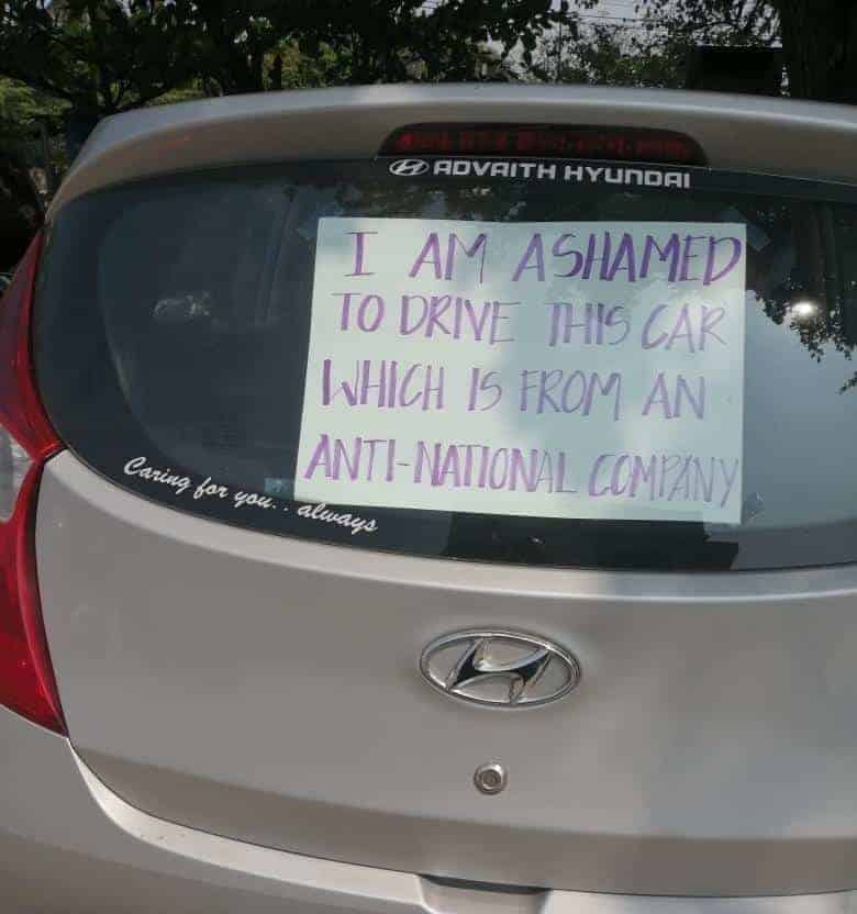 Hyundai Owners have started posting on their cars “I am ashamed to drive this car as it is from an anti national company”