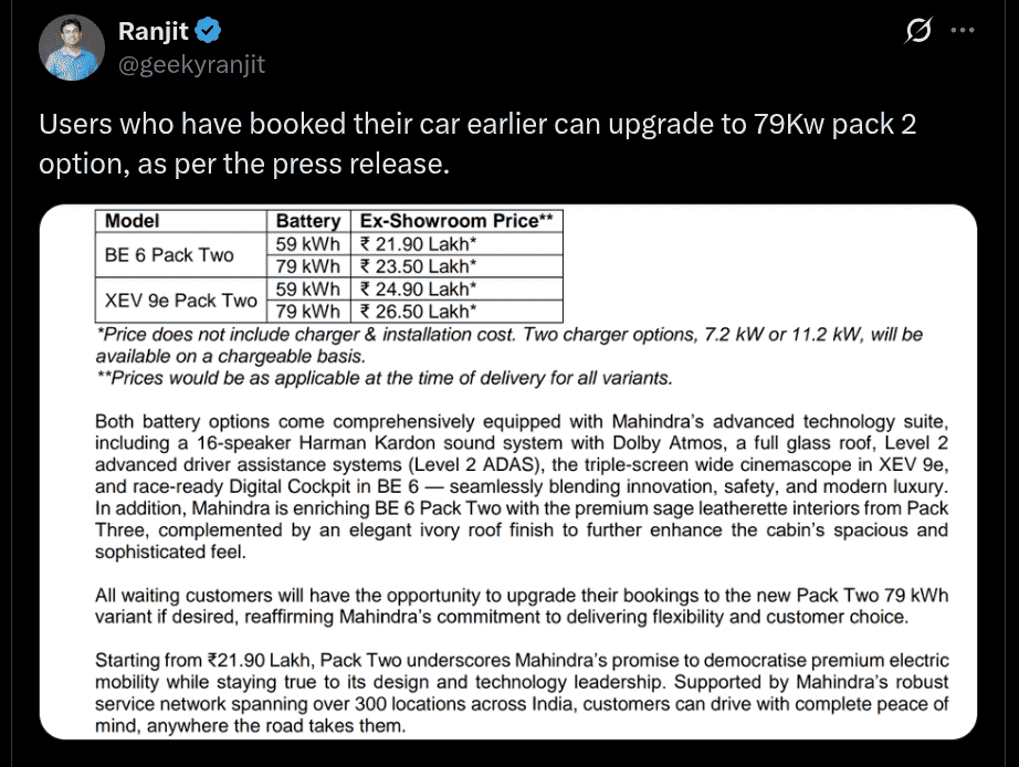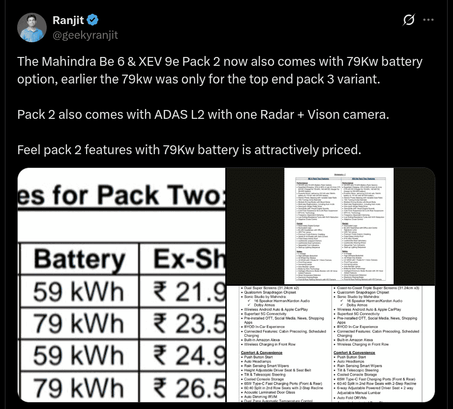 BE 6 and XEV 9e – Pack Two Now Offers 79kWh Battery Option