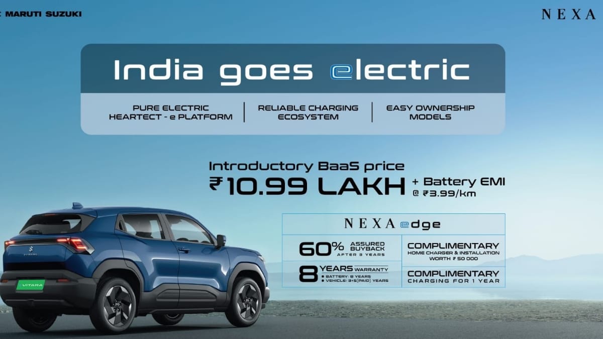 Maruti Suzuki announced that its e-Vitara BEV (Battery Electric Vehicle) will be available in India at an introductory Battery-as-a-service (BaaS) price of Rs 10.99 lakh (ex-showroom), with an additional battery EMI of Rs 3.99/km. The full variant-wise pricing details have not yet been revealed. Bookings for this electric vehicle are open at a price of Rs 21,000 via NEXA showrooms or on the NEXA website.