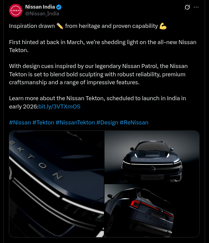 Ahead of its launch that has been scheduled for early next year, Nissan India via its official X handle has teased its upcoming Nissan Tekton. Many of its design aspects have also been revealed.
