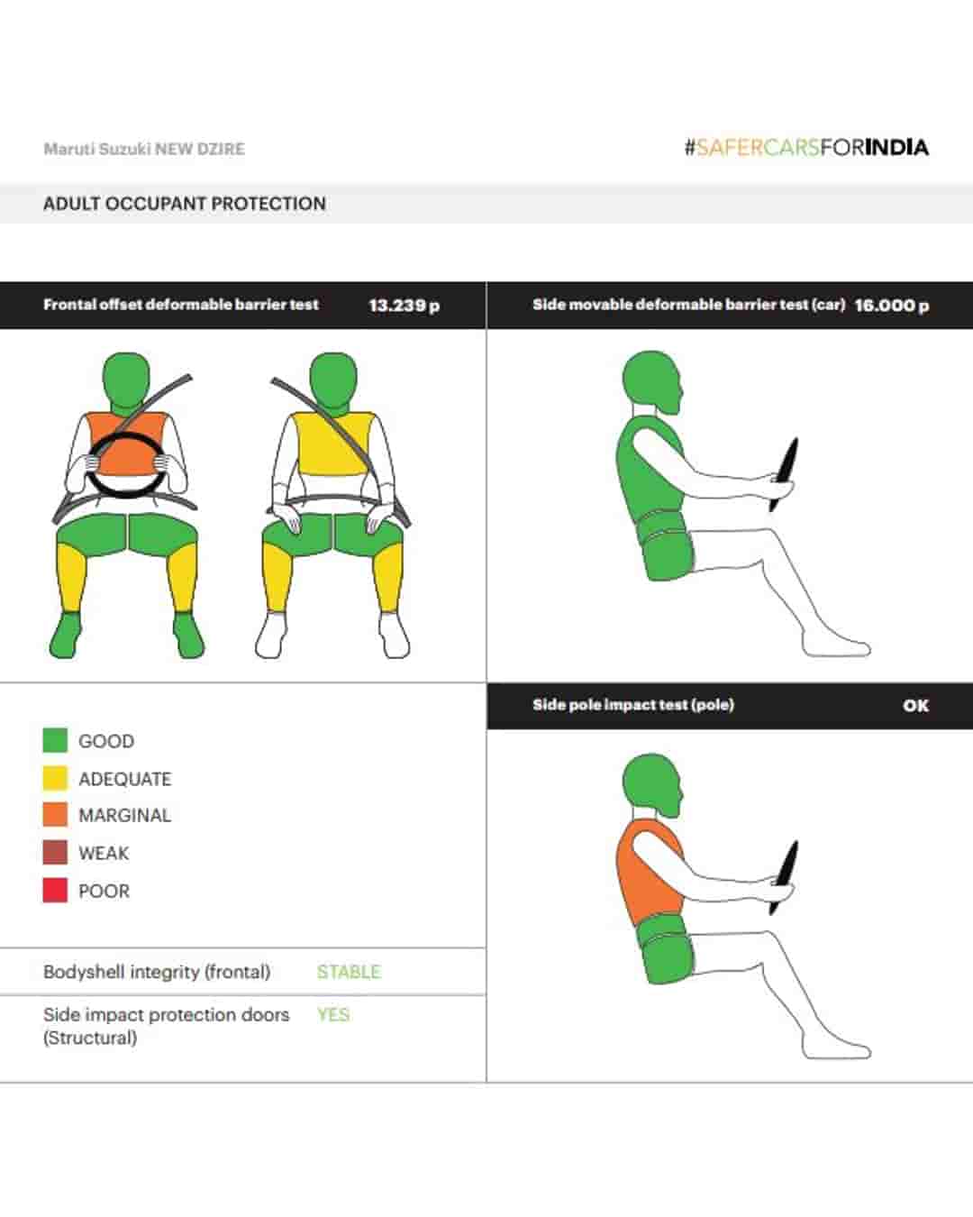 Maruti Dzire tested by Global NCAP came equipped with six airbags, ESC, 3-point seatbelts with reminders for all seats, ISOFIX, mounts for rear outboard seats and front seatbelt pre-tensioner, and load limiter.