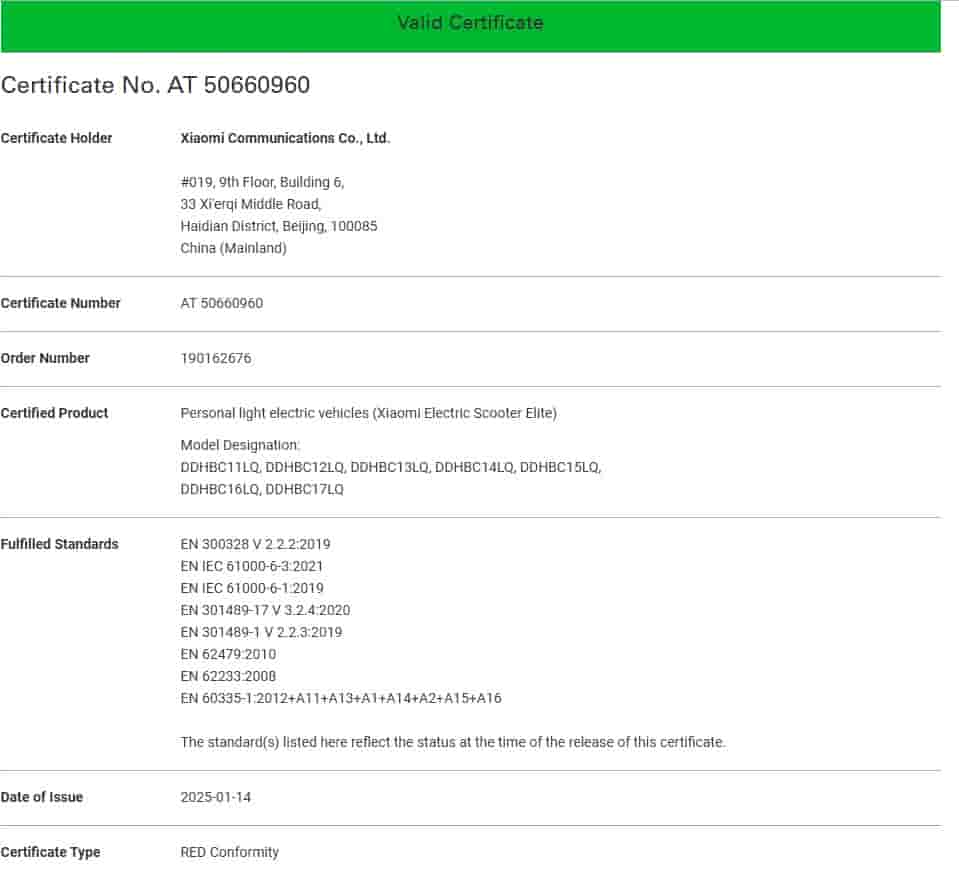 Xiaomi Electric Scooter Elite with model number DDHBC15LQ was spotted on SDPPI certification with certificate number 107115/SDPPI/2025 and PLG ID 9003.