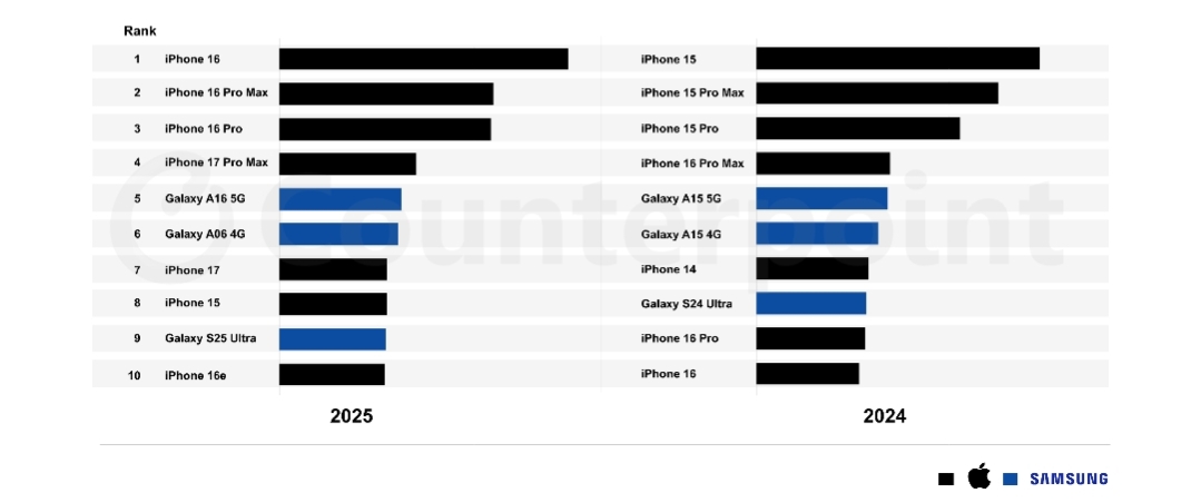 For the past three years, Apple and Samsung dominated the top 10 best-selling smartphone list for the global market, and this year also the brands have also continued to do the same. Counterpoint has officially revealed the global top 10 best-selling smartphones in 2025.