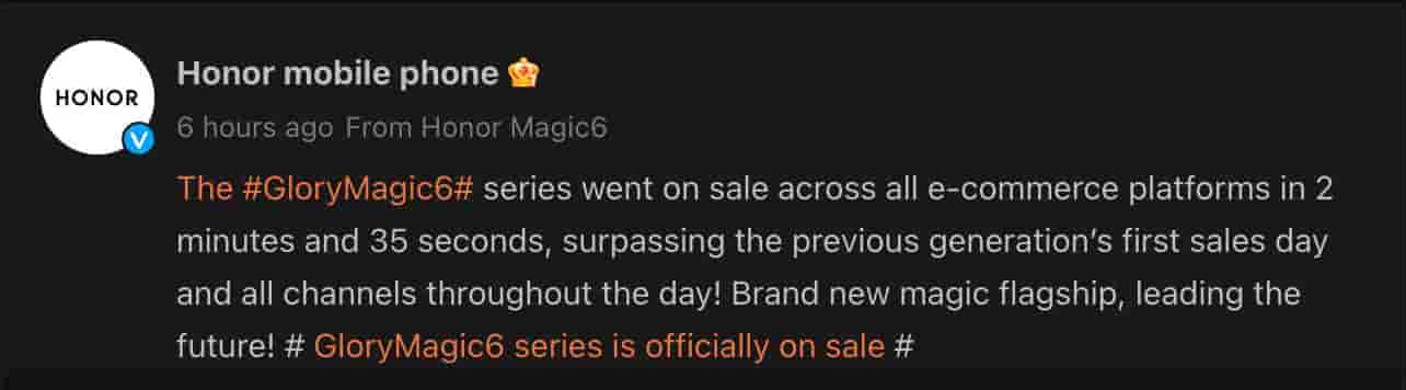 Honor’s Magic 6 series first day sale across all e-commerce platforms has crossed the previous generation’s in less than three minutes.