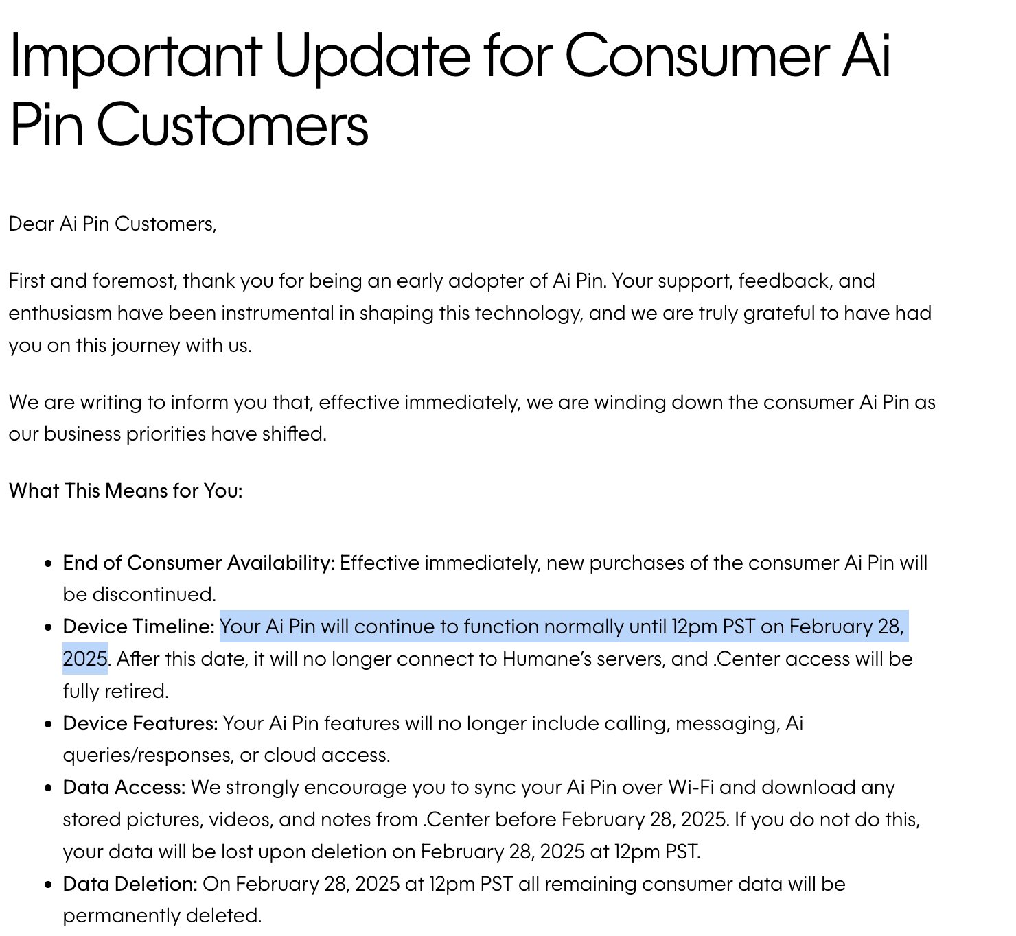 The company has also recommended users sync Ai Pin over WiFi and download any stored pictures, videos, and notes before 28th February 2025. If a user fails to do this, their data will be lost upon deletion on the said date at 12MP IST, also all remaining consumer data will also be permanently deleted.