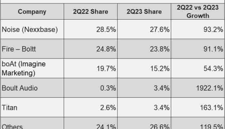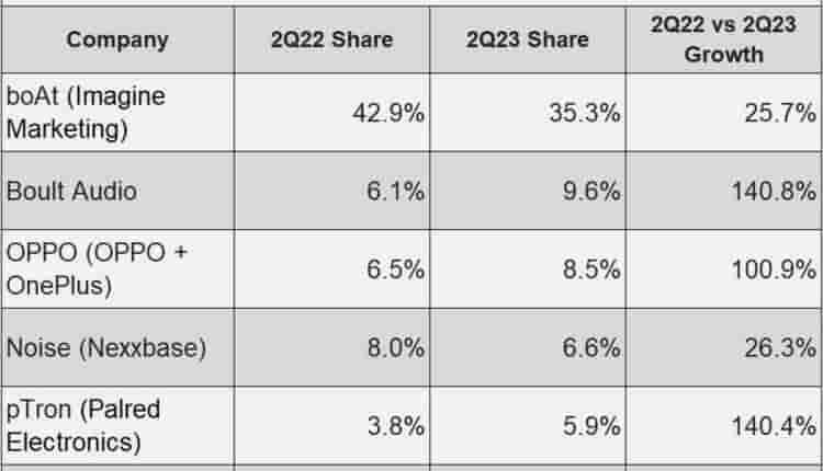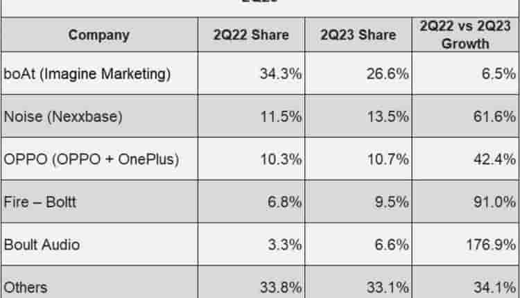 Indian company boAt holds the first position with a 26.6% market share, growing by 6.5% YoY. Earwear has been its core identity that accounts for 77.7% of its shipment in 2Q23 and in the TWS segment, it leads with 35.3% share.