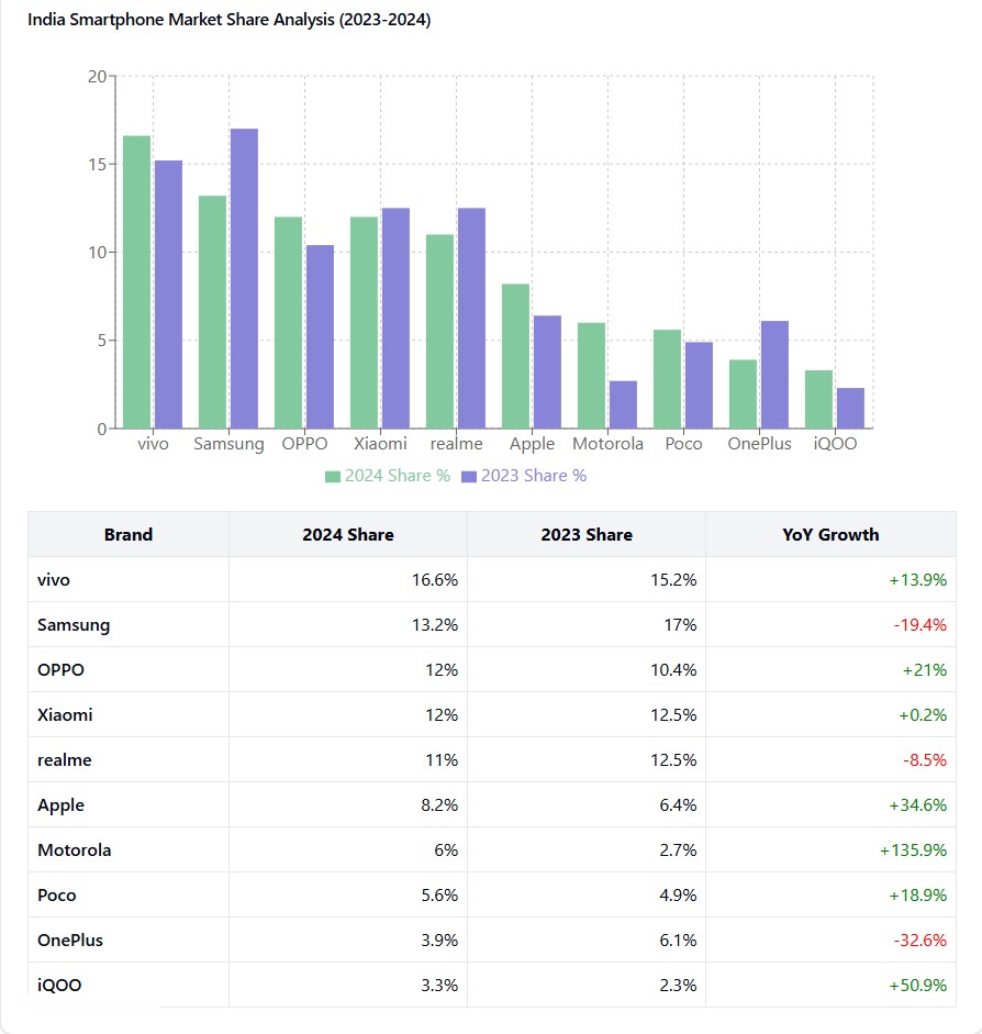 Vivo emerged as the market leader with a 16.6% market share, showing a robust YoY growth of 13.9%, up from 15.2% in 2023. Samsung dropped to second position with its share declining from 17.0% to 13.2%, marking a significant -19.4% YoY decline. OPPO showed strong growth of 21.0% to reach 12% market share, tying with Xiaomi, which maintained relatively flat growth at 0.2%. Realme rounded out the top five with 11% market share, though experiencing an -8.5% YoY decline.