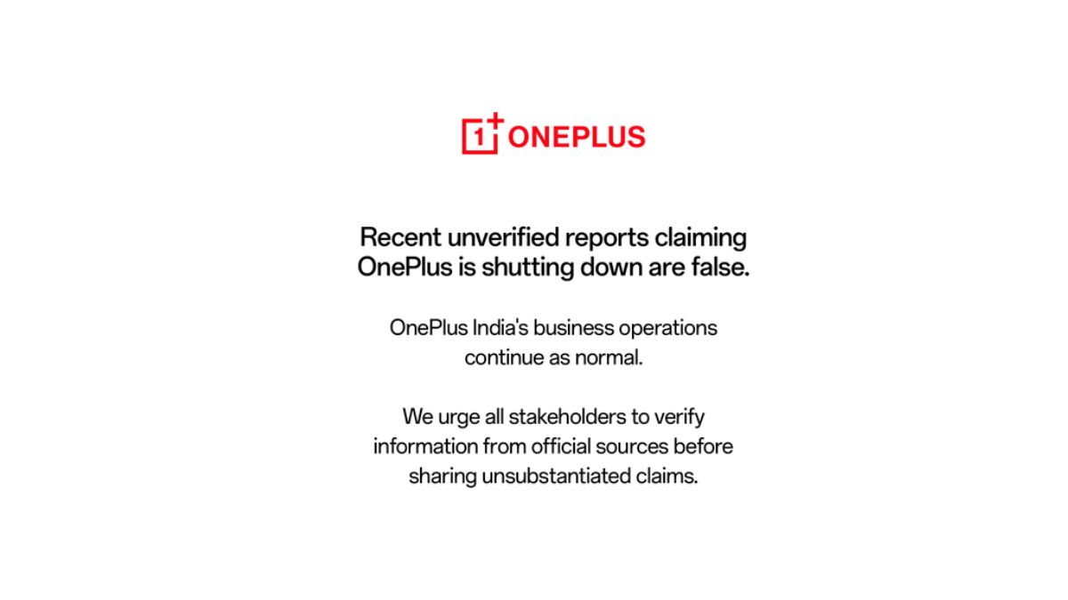 “Recent unverified reports claiming OnePlus is shutting down are false. OnePlus India’s business operations continue as normal. We urge all stakeholders to verify information from official sources before sharing unsubstantiated claims.”
