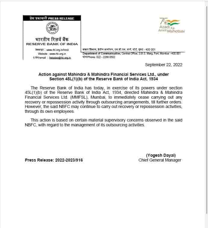 In exercise of its powers under Section 45L(1)(b) of the Reserve Bank of India Act, 1934, the Reserve Bank of India today directed Mahindra & Mahindra Financial Services Ltd. (MMFSL), Mumbai, to immediately cease carrying out any recovery or repossession activity through outsourcing arrangements, until further orders. However, the aforementioned NBFC may continue to conduct recovery or repossession activities through its own employees.