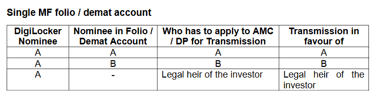 If the DigiLocker nominee is also the nominee in the investor’s account/folio, they can directly initiate the transmission process. Otherwise they can share the information with the joint holder nominee, or legal heir to let them start the transmission process. Also the DigiLocker nominee cannot replace the nominee set by the user for mutual fund folios or demat account.