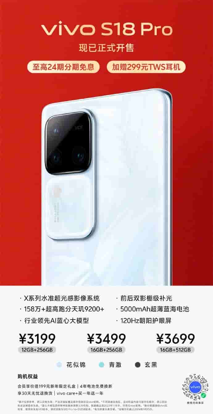 The Vivo S18 Pro smartphone comes in three storage configurations of 12GB/256GB, 16GB/256GB, and 16GB/512GB with price tags of CNY 3199, CNY 3499, and CNY 3699. Other benefits include up to 24 months interest-free EMI, extra TWS headphones for CNY 299, a limited New Year gift box worth CNY 199, 4 years free battery replacement, 30 days of worry-free returns, and Vivo Care (buy one year, get one year free).