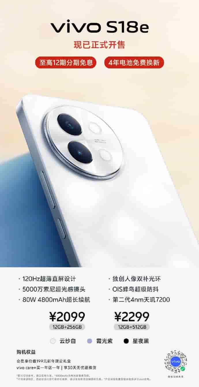 The S18e on the other hand has storage options of 12GB/256GB and 12GB/512GB, priced at CNY 2099 and CNY 2299. The added benefits are the up to 12 months interest-free EMI, 4 year battery replacement, a limited New Year gift box worth CNY 199, 30 days worry free returns and exchanges, and Vivo Care (buy one year, get one year free).