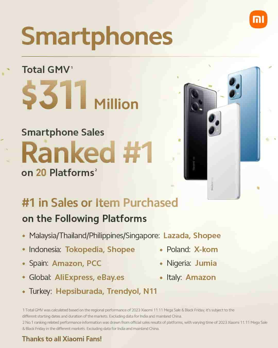 In the smartphone sale itself, the brand received the highest GMV of $311 million and was ranked 1st on 20 platforms. Xiaomi was ranked 1st in sales or items purchased on platforms such as Lazada & Shopee (of Malaysia, Thailand, Philippines, & Singapore); Tokopedia & Shopee (of Indonesia); X-kom (of Poland); Amazon & PCC (of Spain); Jumia (of Nigeria); AliExpress & eBay.es (Global); Amazon (Italy); and Hepsiburada, Trendyol, & N11 (of Turkey).