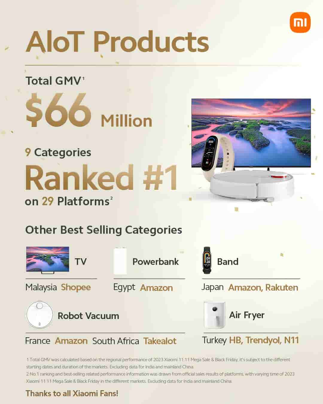 Through the AIoT product sales, Xiaomi made $66 million. On 29 platforms, Xiaomi was ranked 1st in 9 categories. Some of the best-selling categories for Xiaomi include TV on Malaysia’s Shopee; power bank on Egypt’s Amazon; smart band on Japan’s Amazon & Rakuten; robot vacuum on France’s Amazon & South Africa’s Takealot, and Air Fryer on Turkey’s HB, Trendyol, & N11.