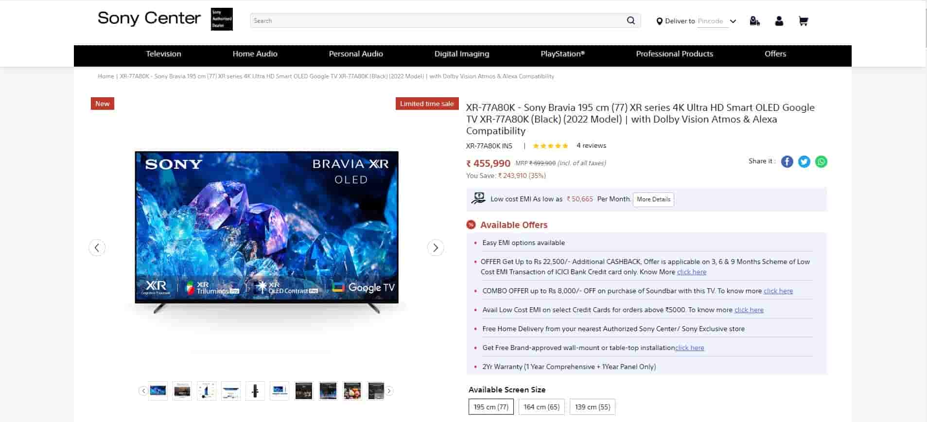 This TV is available on Sony Center at a massive discount of 35% which lets you save up to Rs 243,910. The discount on this TV has brought down the price from Rs 699,900 to Rs 455,990. You can buy this TV through the EMI option in which you will have to pay only Rs 50,665 a month. You can get up to Rs 22,500 additional cashback on EMI interest using ICICI Bank Credit Card.