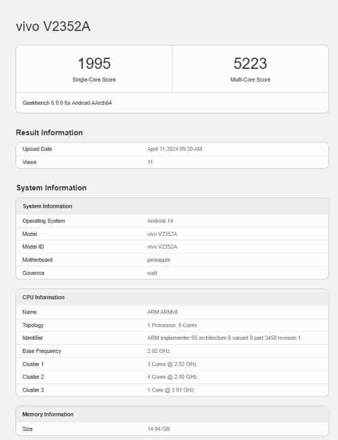 Now the smartphone has appeared on Geekbench with the model number V2352A. This smartphone has managed to get 1975 in the single-core test and 5208 in the multi-core test. As it’s known this smartphone will be powered by the Snapdragon 8s Gen 3 processor paired with Adreno 735 GPU and will pack 16GB RAM. As per the listing, the smartphone will run Android 14 out of the box. The rest of the information on the handset remains under wrap.