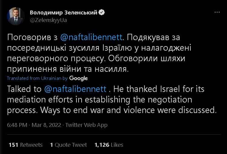Ukrainian President Zelenskyy today thanked Israel’s Prime Minister Naftali Bennett. He said that Talked to Naftali Bennett. He thanked Israel for its mediation efforts in establishing the negotiation process. Ways to end war and violence were discussed.