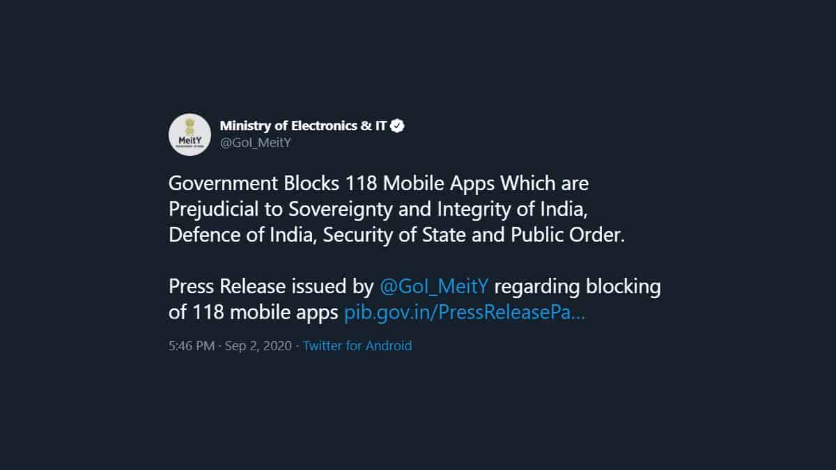 The Ministry of Electronics & IT stated that “Government Blocks 118 Mobile Apps Which are Prejudicial to Sovereignty and Integrity of India, Defence of India, Security of State and Public Order. Press Release issued by @GoI_MeitY regarding blocking of 118 mobile apps”