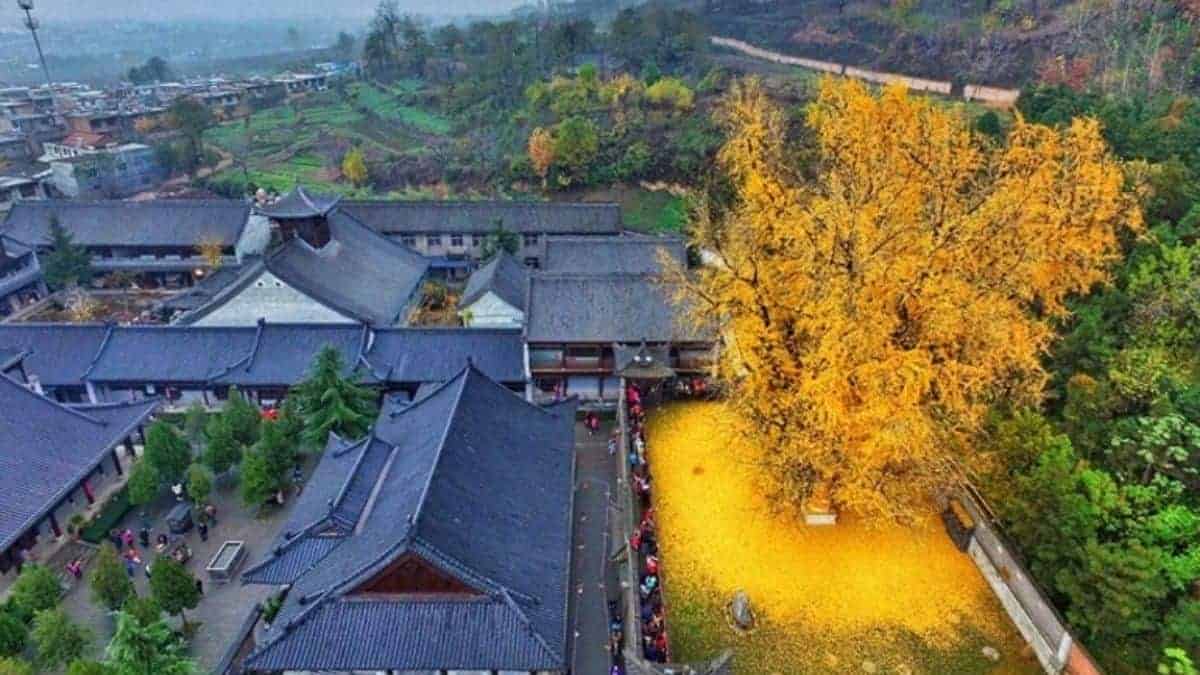 The 1,400-year-old ginkgo tree can be found within the walls of China’s Gu Guanyin Buddhist Temple in the Zhongnan Mountain region.