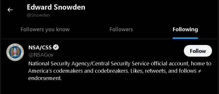 Even though he was the one who brought the facts against NSA, he still follows NSA on Twitter and is the only account followed by him.
