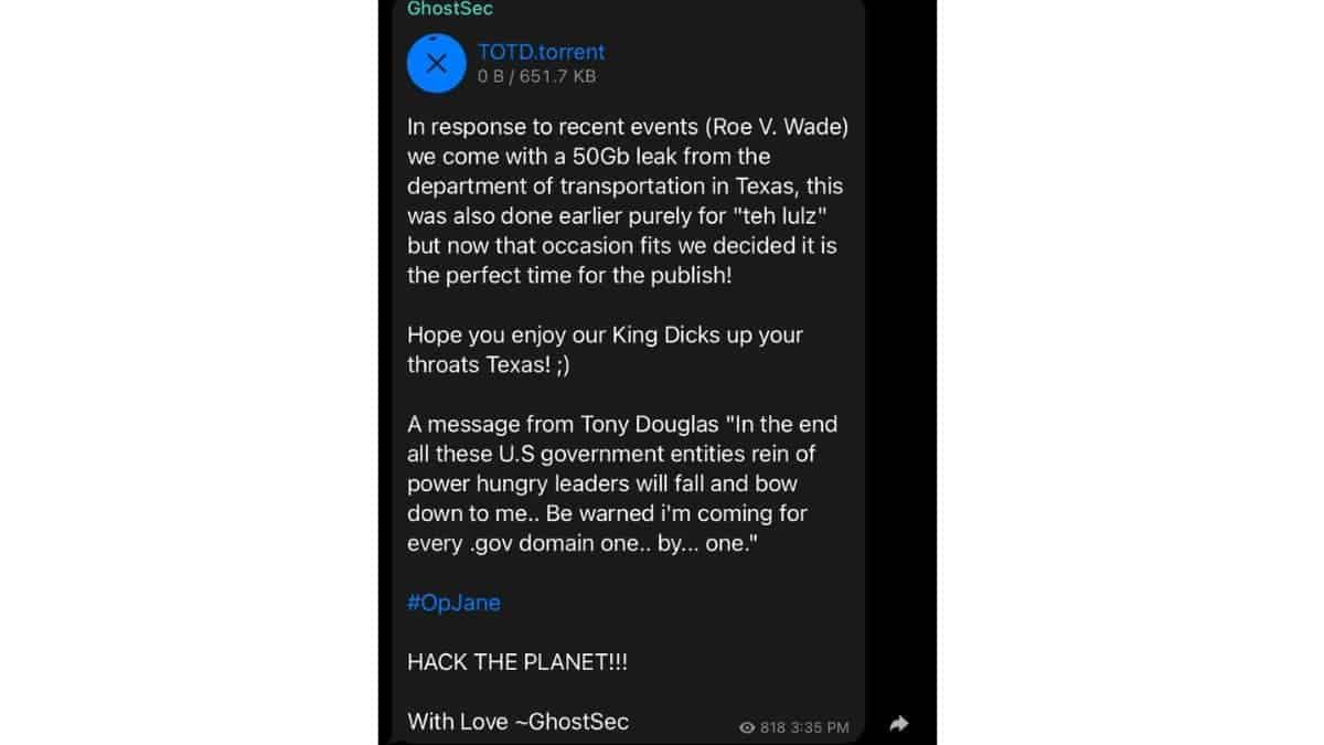 GhostSec has claimed to leak 50 Gb worth of data from the department of transportation in Texas in response to the Roe v. Wade verdict. GhostSec is a branch of the Anonymous Collective that gained popularity by claiming to hack several ISIS-affiliated websites back in 2015 for the Charlie Hebdo shooting in Paris. Recently, GhostSec claimed on Twitter that they have revealed the hacked data on Telegram.