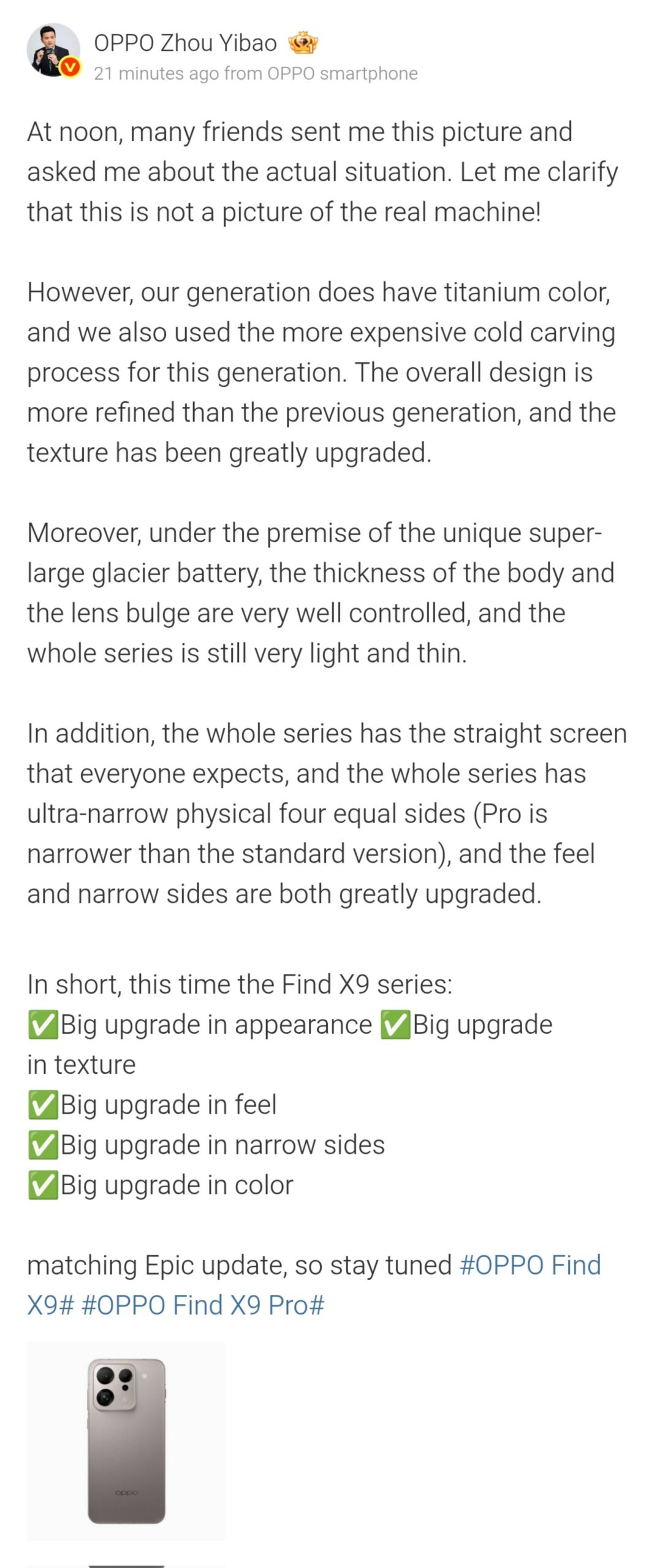 In his Weibo post, Zhou Yibao notes that the design of the OPPO Find X9 revealed in the shared image ‘is not a picture of the real machine’, however this generation of the flagship smartphone indeed has a Titanium color choice. Furthermore, he adds that the brand has used a more expensive cold carving process this time and in comparison to its predecessor, the overall design of the successor has been refined. The texture has also been ‘greatly upgraded’ as mentioned by Zhou Yibao, and the thickness and lens bulge of the entire series is controlled to maintain a thin and light form factor design – thanks to the ‘unique super-large glacier battery’. Speaking more, flat displays with symmetrical thin bezels have also been revealed for the whole Find X9 series, and the pro model is claimed to feature even thinner bezels than the standard model.