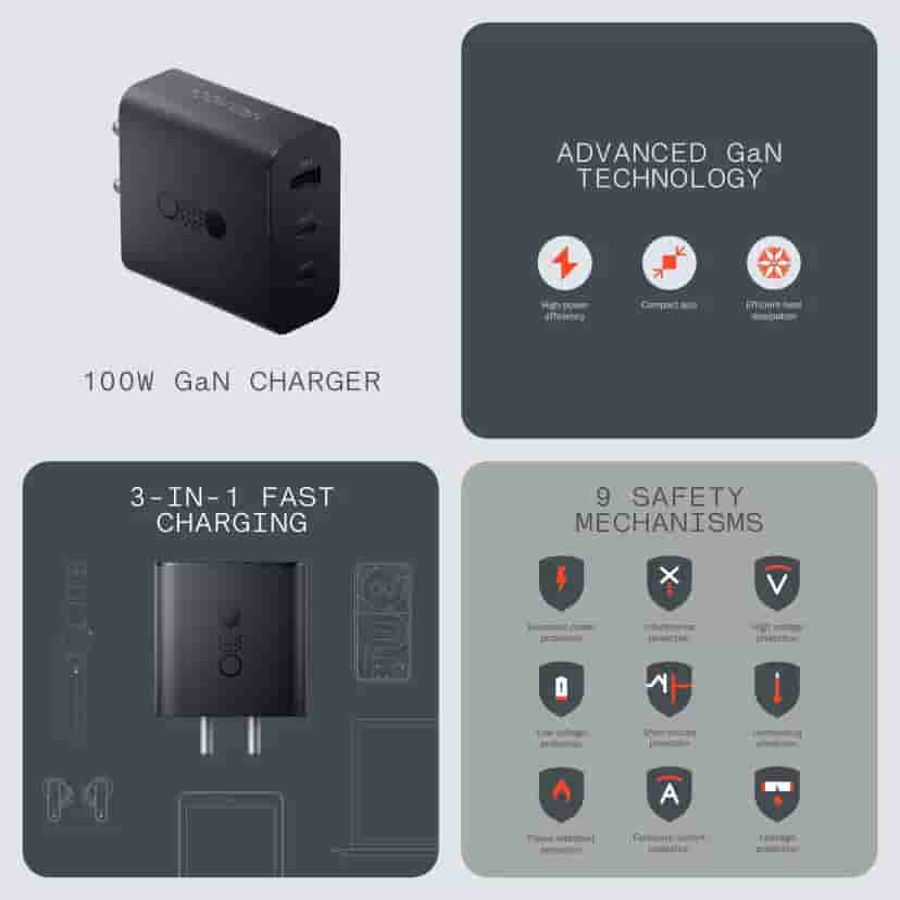 The CMF by Nothing 100W Power GaN charger (C269) measures 61.5mm x 60.5mm x 30mm. It features three ports for simultaneous charging of multiple devices, supporting both USB-C and USB-A connections. The charger uses GaN technology and offers a 100W power output. It includes a detachable cable and comes in Dark Grey and orange colour. It also comes with 9 safety features, such as: