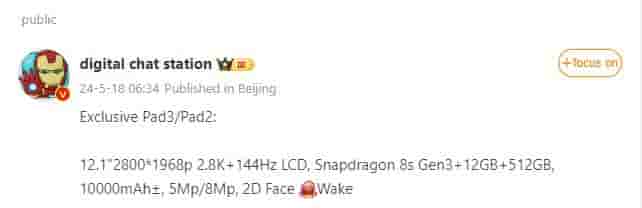 The tablets are tipped to feature a 12.1 inch LCD display that offers 2.8k resolution and 144Hz refresh rate. They will be powered by Snapdragon 8s Gen 3 SoC that will be paired with 12GB RAM and 512GB storage. They are said to be backed by a 10,000 mAh battery while the 3C listing suggested that they could support 44W fast charging. They are said to pack up 5MP and 8MP front and back cameras. The tablets are also said to arrive with 2D Facial recognition.