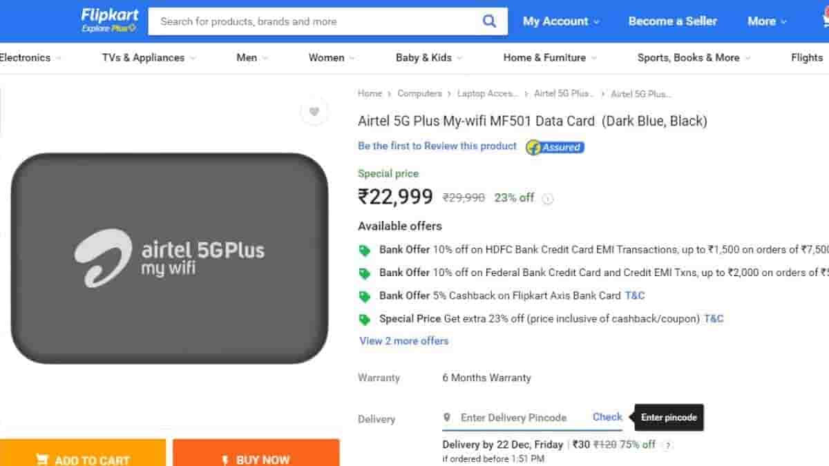 Airtel 5G Plus My-WiFi portable router available for purchase on Flipkart at a special price of Rs.22,999