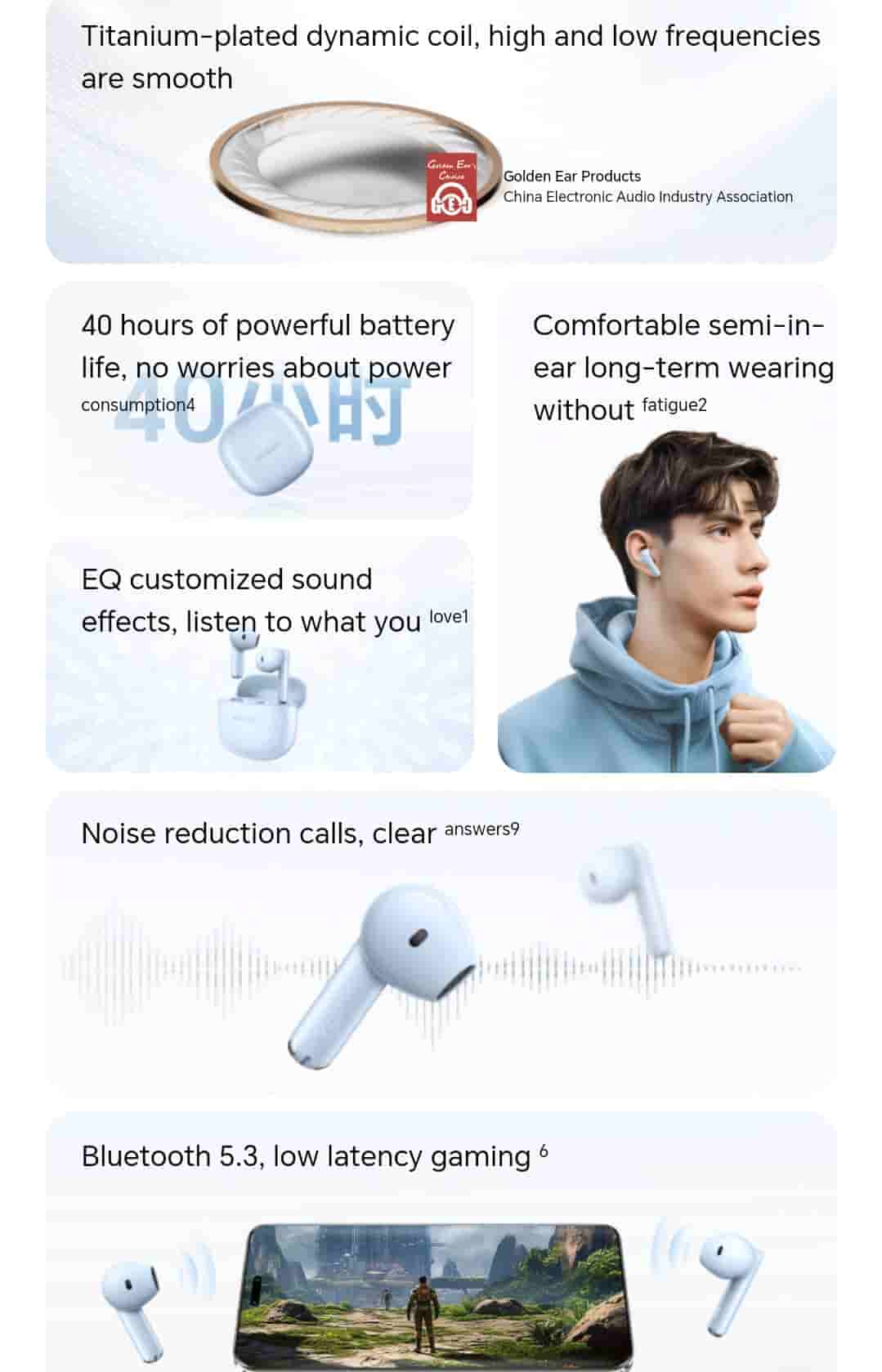 These earbuds sport a polymer composite titanium-plated diaphragm and a 10mm dynamic unit that offer delicate treble and abundant bass. It arrives with HiFi 5 DSP high-performance computing technology. It offers four EQ sound effects- Bright high notes, powerful bass, warm vocals, and a classic soundtrack.