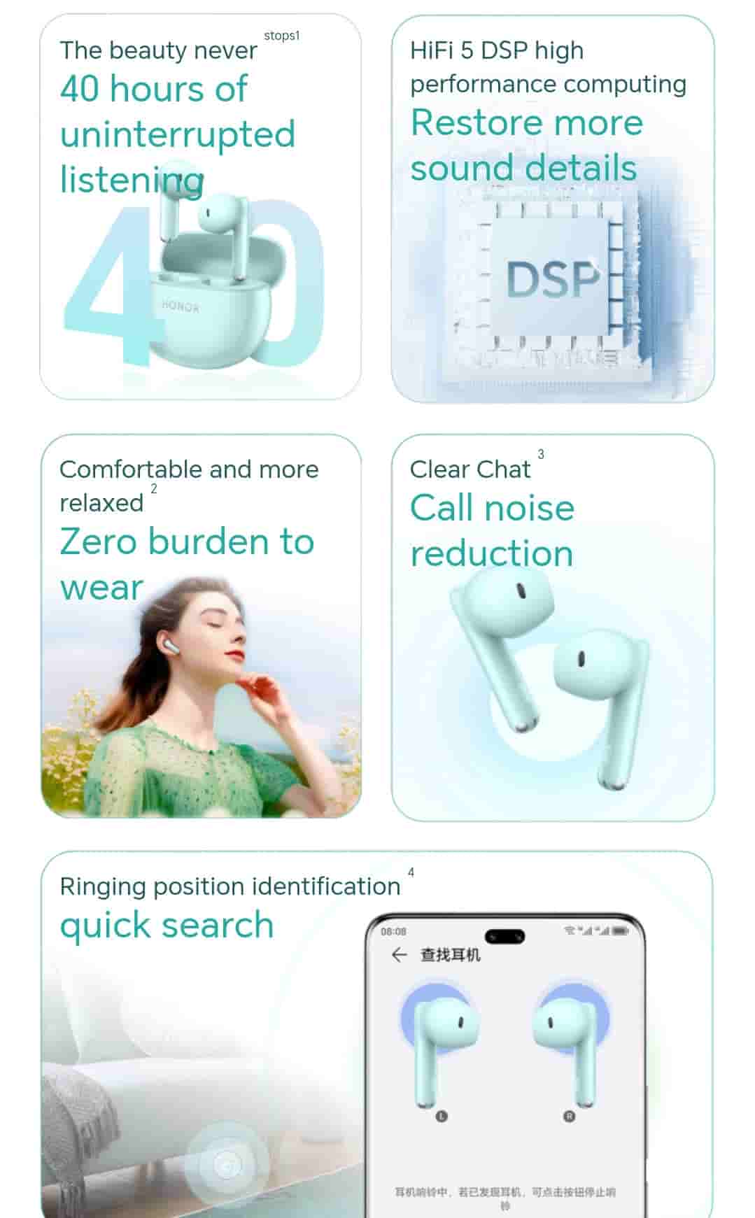 The earbuds feature a semi-in-ear ergonomic design while each earbuds weigh 3.8g. The earbuds offer 9 hours battery life on a single full charge while along with the charging case it offers up to 40 hours battery life. The earbuds support Bluetooth 5.3 connectivity and offer low-latency gaming. The earbuds also support touch controls and arrive with an IP54 rating for dust and splash resistance. It is compatible with the Honor smart space app and if in case you lose your earbud accidentally you can find it with the help of the earphone search function. It comes with an AI call noise reduction feature.