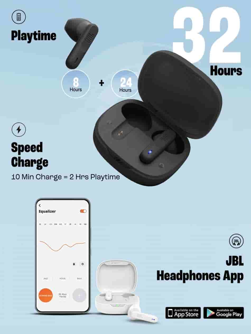 The 32-hours total playback time consisting of the 8-hours listening time on the earbuds and the 24-hours additional listening time from the case will help users enjoy a longer usage time. The speed charge feature supported on the device will also let users receive 2-hours of playtime with just 10-minutes charge. To add, with the JBL Headphones App, equalizer can be manually adjusted or modes such as Jazz, Vocal, Bass, Extreme Bass, and JBL Wave Beam EQ can be selected.