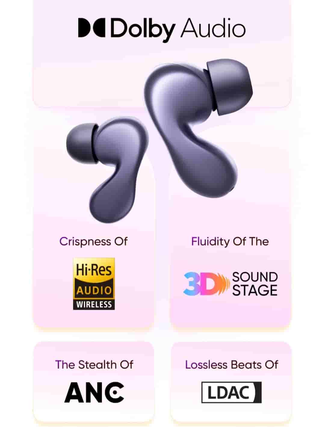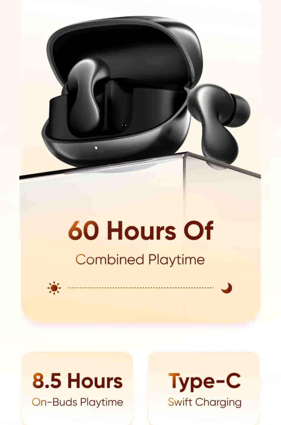 Users can experience instrumental clarity with 3D Sound Stage technology. The earbuds along with the case offer 60 hours of total playtime while the earbuds alone offer 8.5 hours of playtime. The earbuds can be charged via a Type-C port.