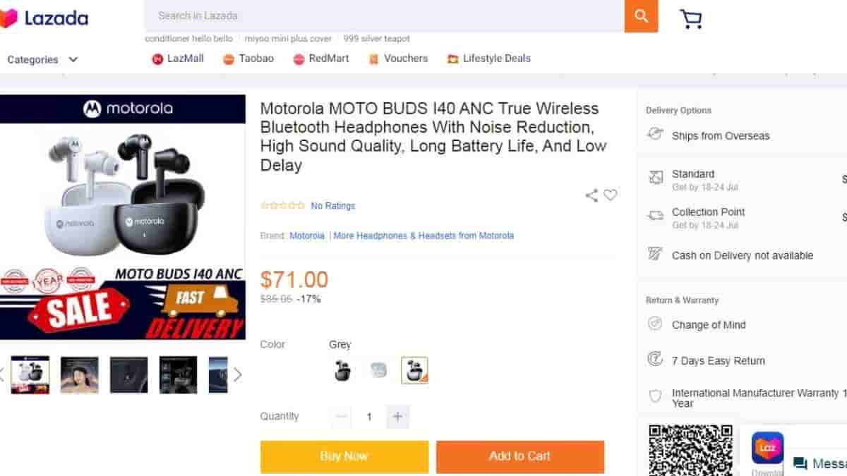 Moto Buds i40 ANC Wireless Bluetooth headphones have been found listed on the Lazada website in Singapore. Though Motorola has not shared any details regarding these earbuds as per the website the earbuds are available for sale at $71.00 (Singapore Dollar).