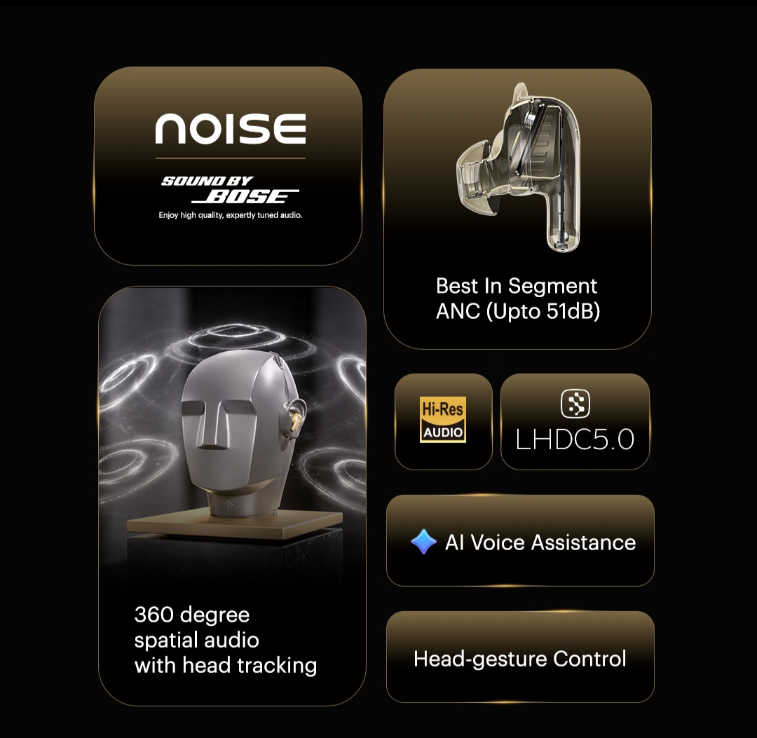 Master Buds 2 tuned with Sound by Bose technology delivers balanced, distortion-free audio with deep bass, clear mids, and crisp highs. It is equipped with 10mm PU+ PEEK drivers and supports adaptive ANC up to 51dB. There are 6-mic with ENC and Sound+ DNN neural network algorithm.